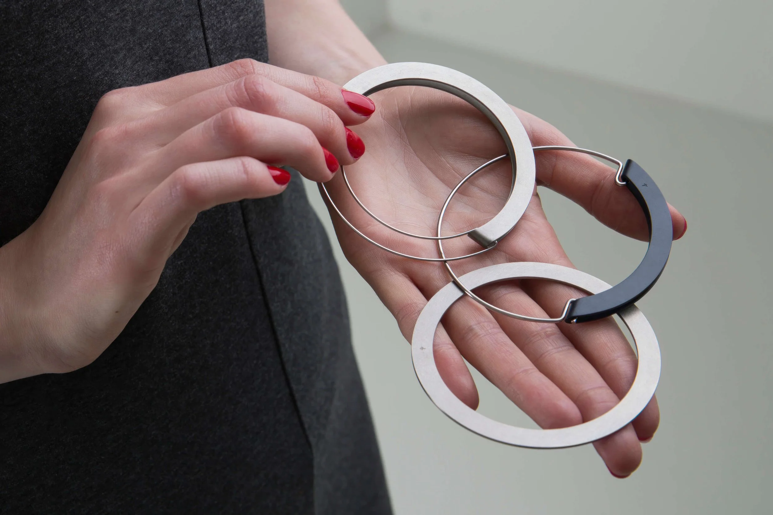 Phoebe Porter is an Australian contemporary jeweller who combines geometric abstraction, bold colour and balancing of juxtaposed elements to create work that resonates with influences of the Bauhaus and Russian Constructivism.