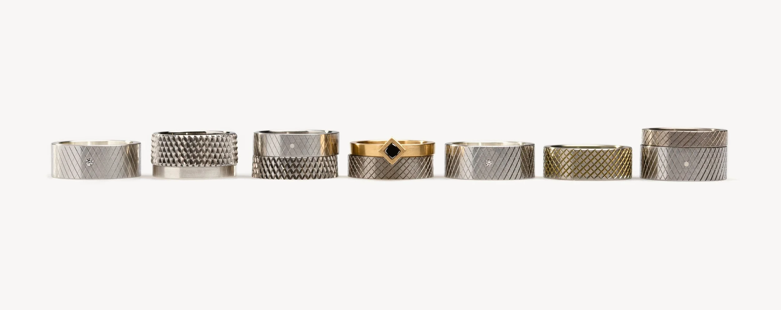 Inspired by the aesthetics of vintage precision machinery and geometric abstraction, Phoebe employs processes such as turning, milling, knurling, and anodising to craft rings with textured surfaces and interlocking parts. These pieces invite touch, offering a sensory experience for the wearer.
