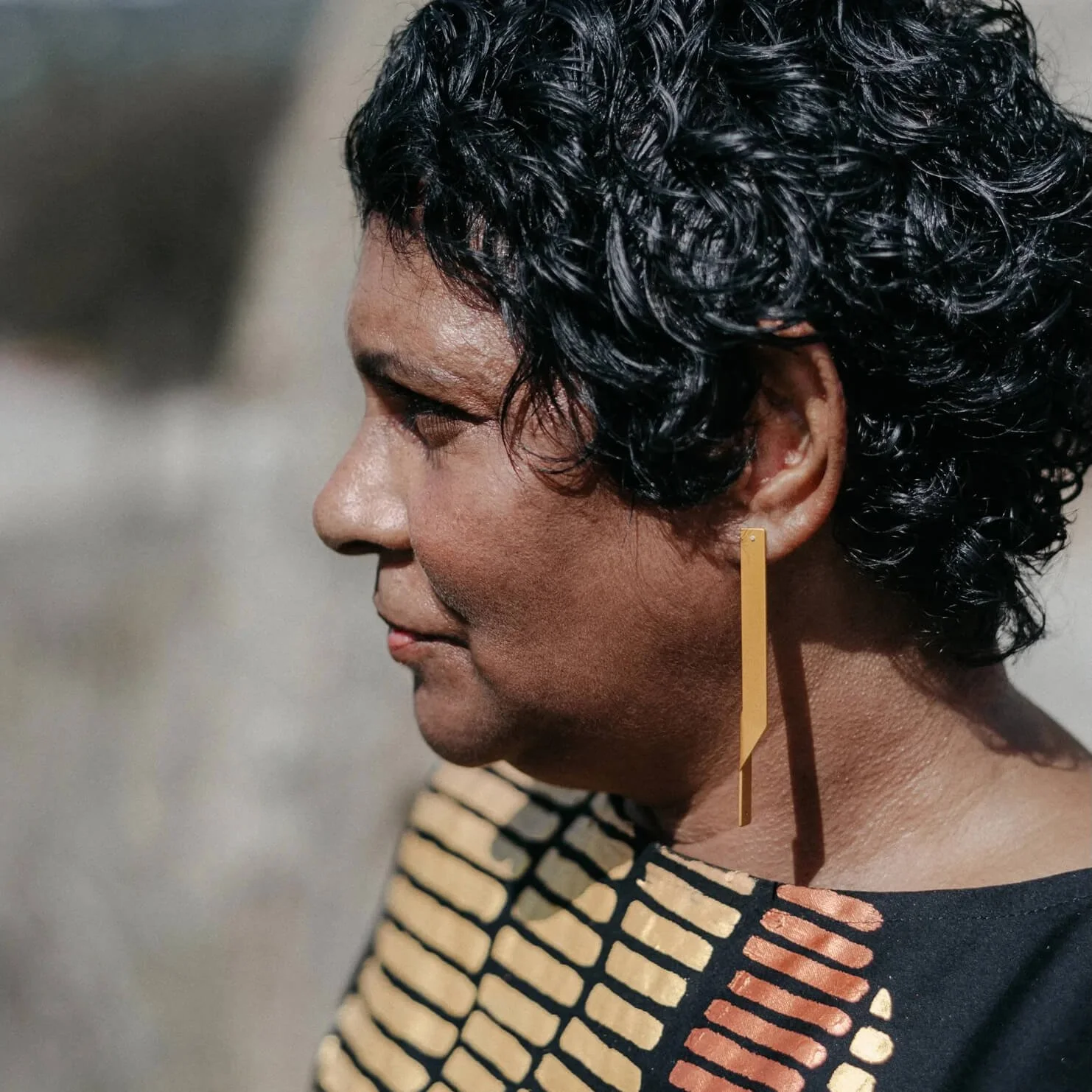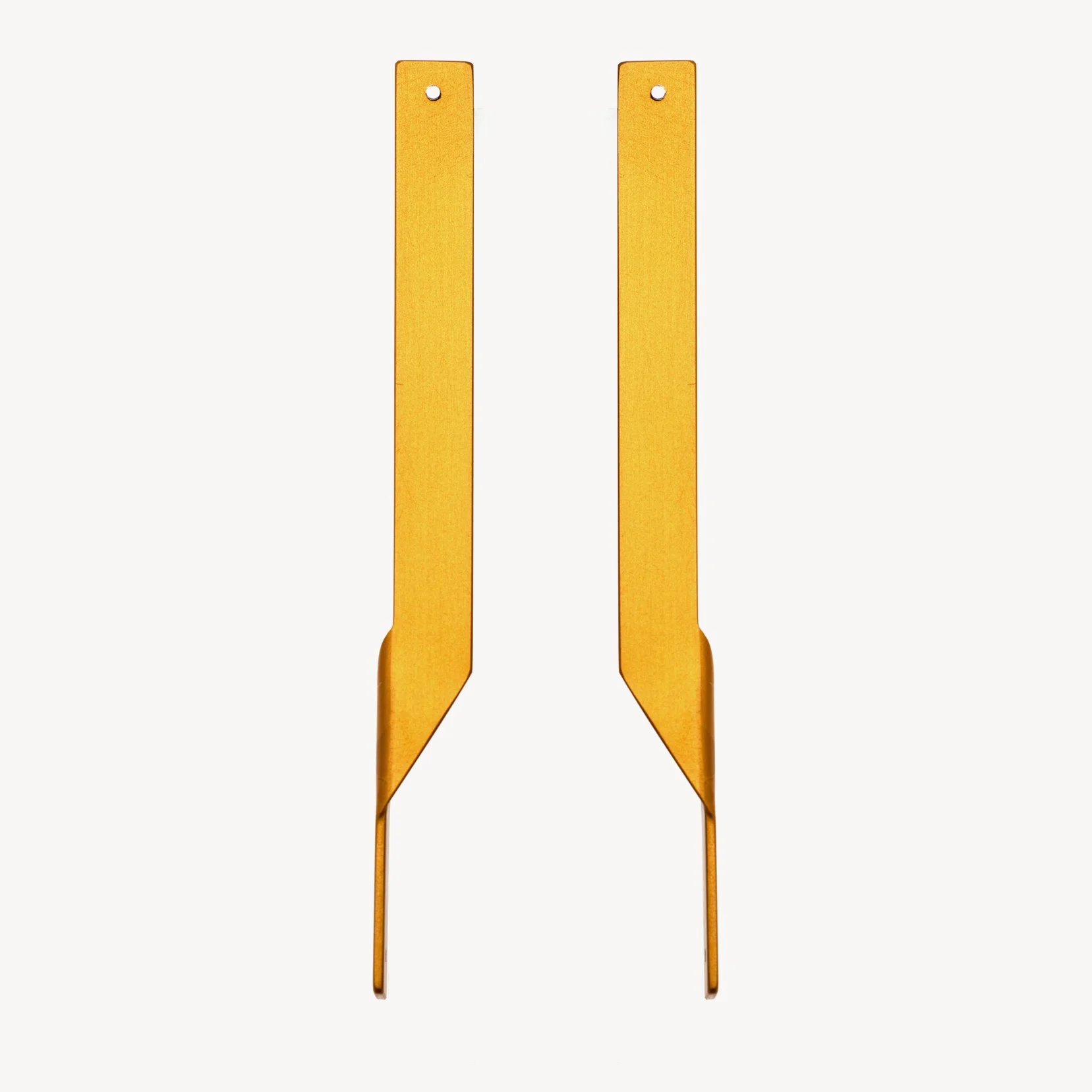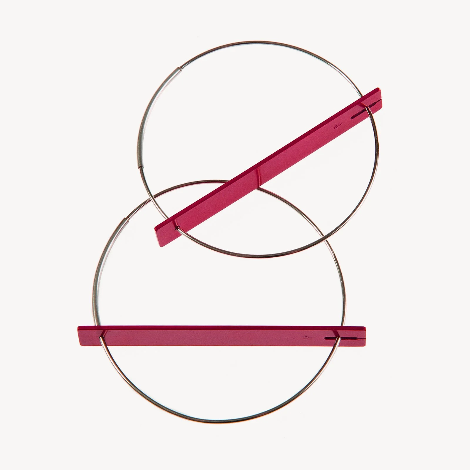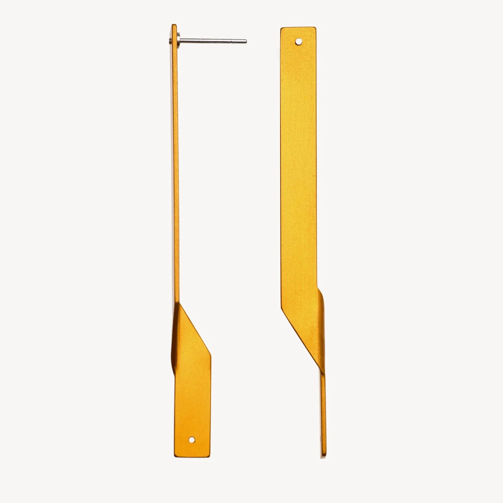 These architectural Quarter Twist earrings are deceptively simple. Each earring is made from a single piece of aluminium formed using a custom tool and drilled to provide a hole for the anodising jig, which is then filled with a handmade sterling silver ear post riveted in place.