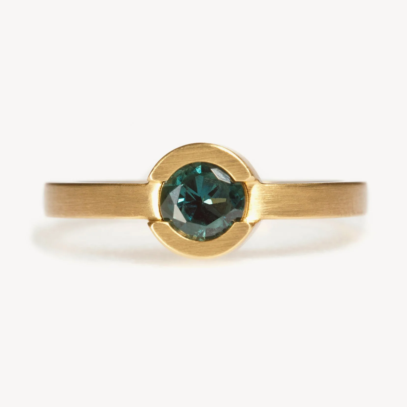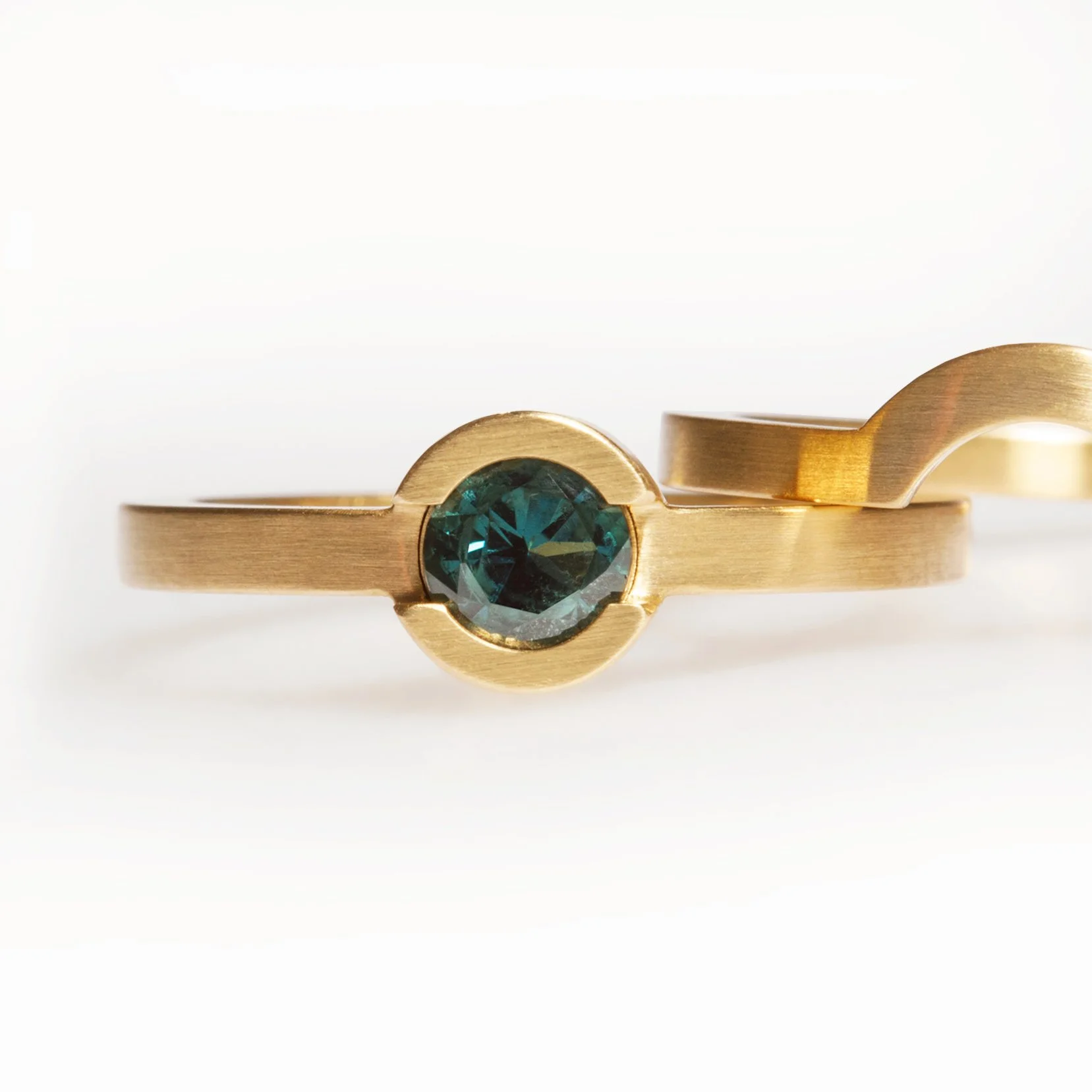 This ring is part of Phoebe Porter’s Modern Love Collection – an exploration of geometric abstraction and compositional balance to create future heirlooms that resonate with the influences of early modernism and elegant industrial minimalism. It features a sparkling round champagne diamond, perfectly framed in a modern yellow gold setting. This ring is beautifully complimented by Phoebe’s Circular Wedding Band in yellow gold + champagne diamonds.